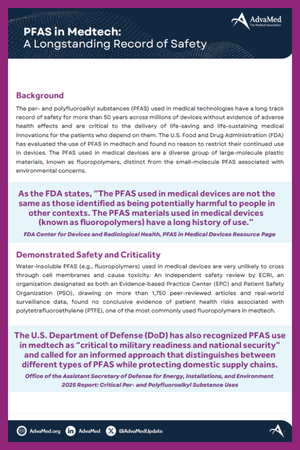 This one-pager provides a clear, accessible overview of PFAS use in medical technology and highlights the strong safety record that has guided the industry for more than fifty years. It explains how the PFAS used in medtech — specifically fluoropolymers — differ from the small-molecule PFAS often associated with environmental concerns, and why that distinction matters. The document underscores FDA findings that support the continued use of PFAS in medical devices and details independent evidence showing no conclusive links between these materials and adverse patient outcomes. It also points to the Department of Defense’s recognition of PFAS as essential to military readiness and secure supply chains. Altogether, the piece reinforces a simple message — PFAS materials used in medtech are well studied, historically safe, and critical to the reliability and performance of life-saving devices patients depend on.